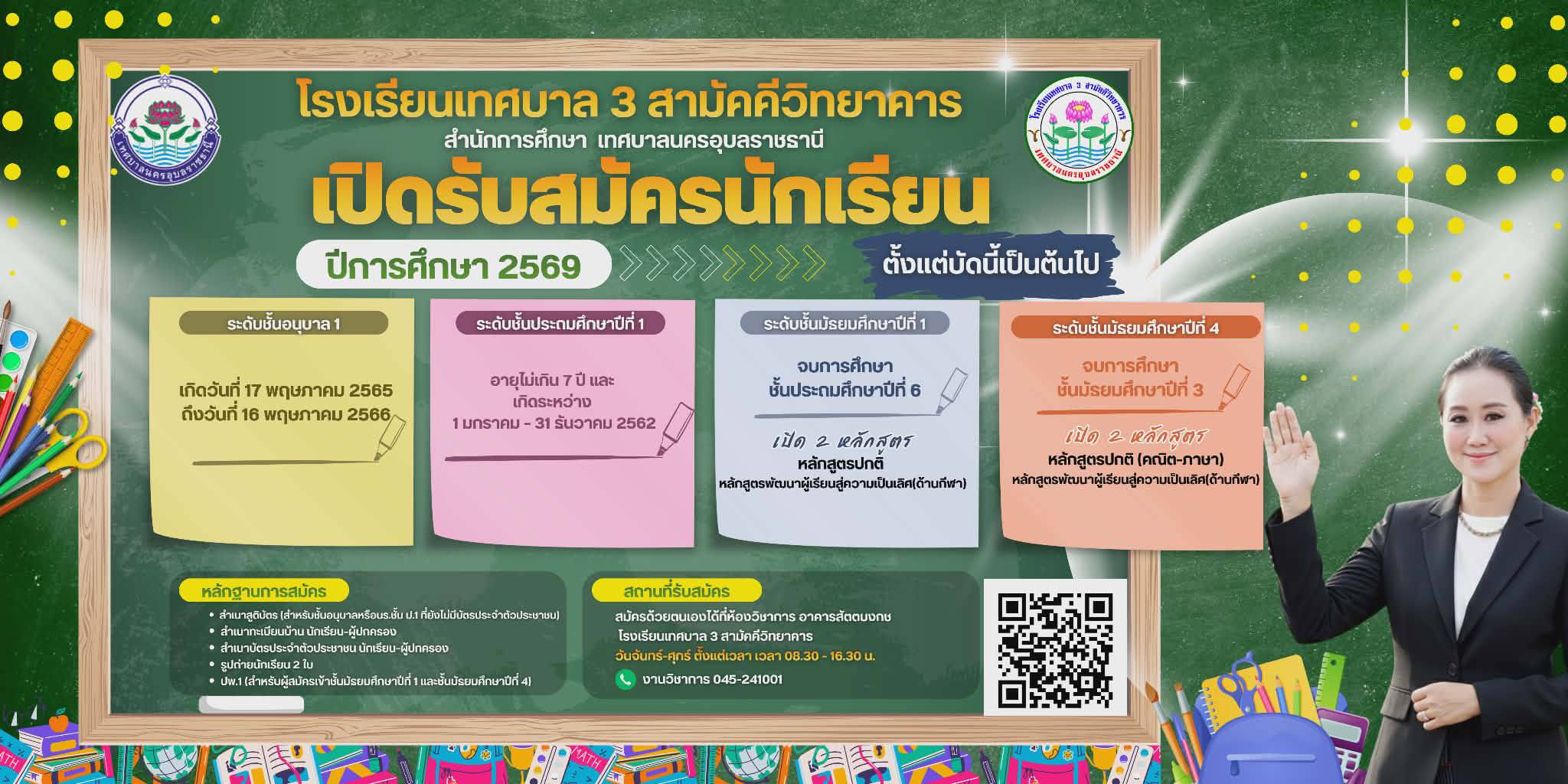 โรงเรียนเทศบาล 3 สามัคคีวิทยาคาร ภายใต้การนำของ นางสาวพิศทยา ไชยสงคราม นายกเทศมนตรีนครอุบลราชธานี เปิดรับสมัครนักเรียน ประจำปีการศึกษา 2569 ตั้งแต่บัดนี้เป็นต้นไป