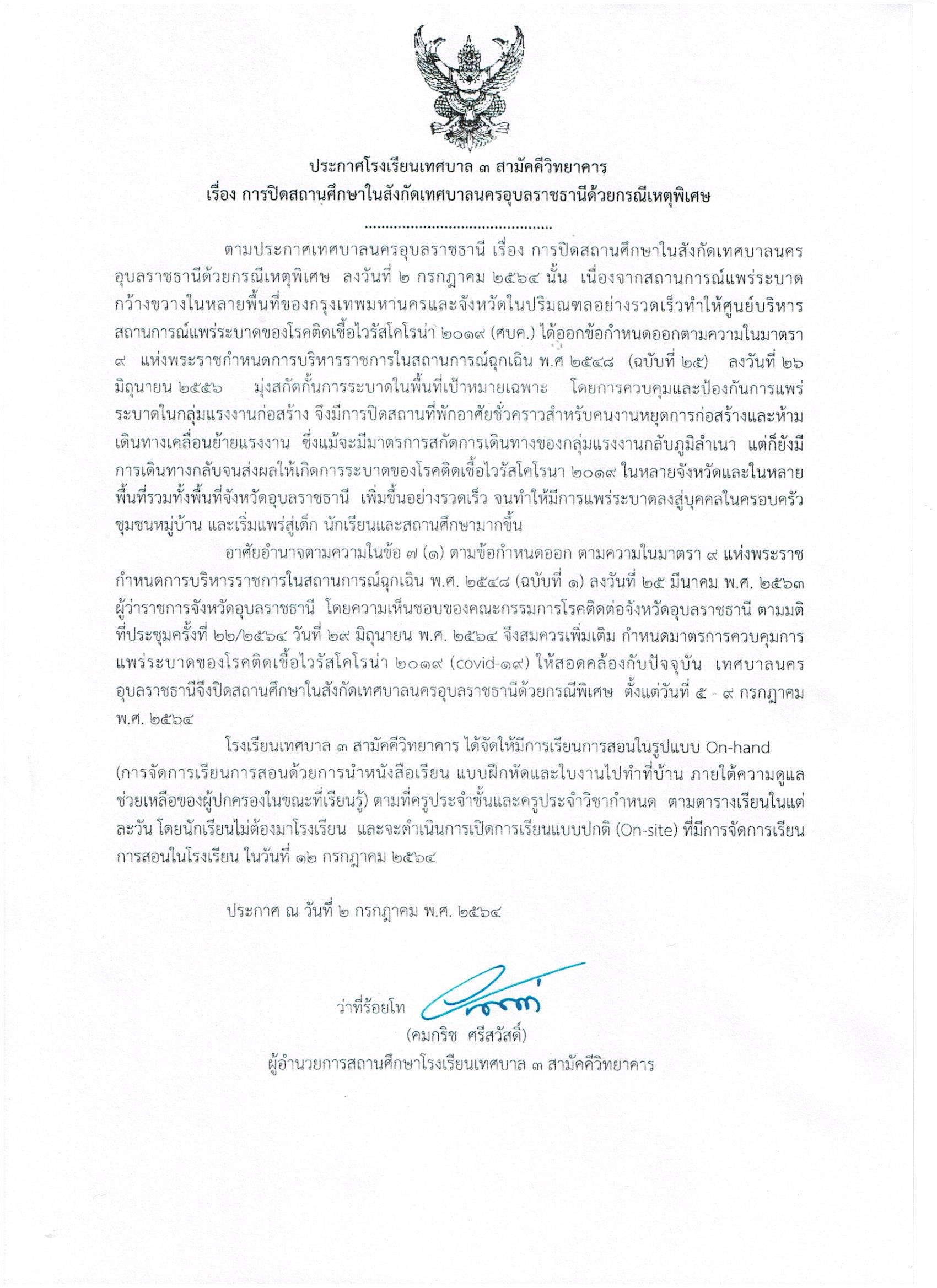 เรื่อง การปิดสถานศึกษาในสังกัดเทศบาลนครอุบลราชธานีด้วยกรณีเหตุพิเศษ